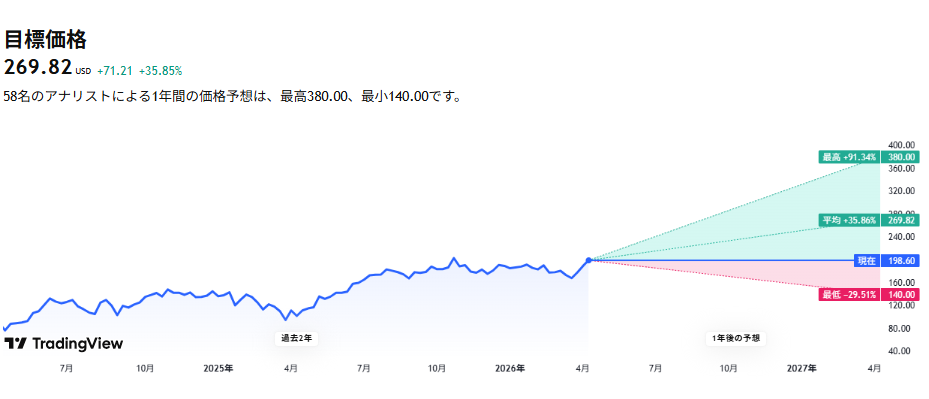 市場アナリストの平均目標株価は約264ドルで、強気な予想では350ドルを超えるとの声もあります。