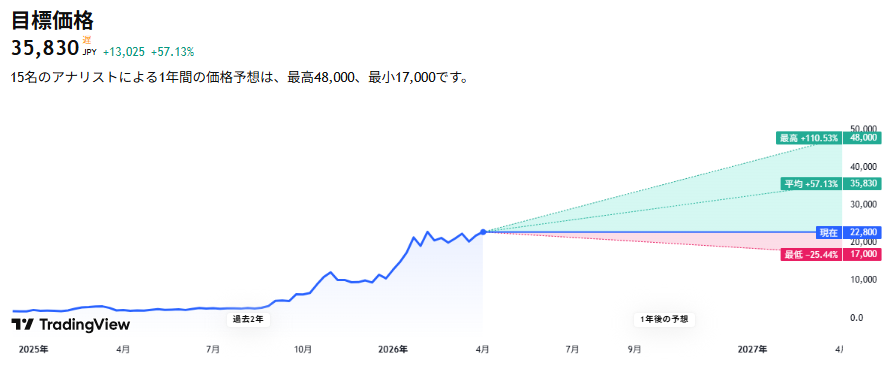 2026年1月時点の株価(約18,000円〜21,000円)は、専門家たちの平均目標株価(約15,300円程度)を上回っており、短期的な目線では「割高感」を警戒する局面です。