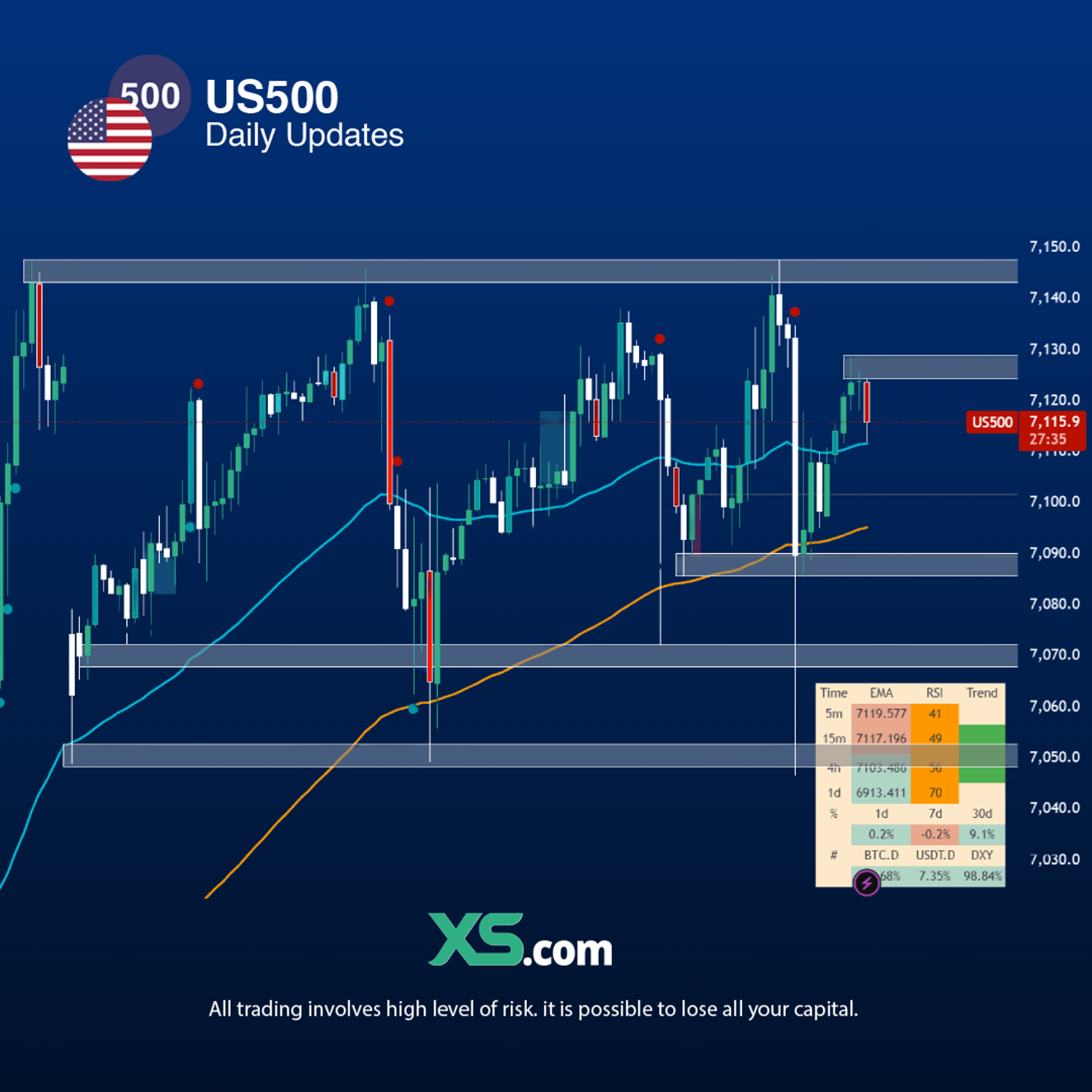 Hiện tại, US500 đang tiếp cận hỗ trợ động được tạo bởi EMA50 sau khi thiết lập mức đỉnh thấp hơn tại 7,120-7,130 cho thấy động lực tăng đang chậm lại và thị trường đang bước vào pha tích lũy ở vùng cao.