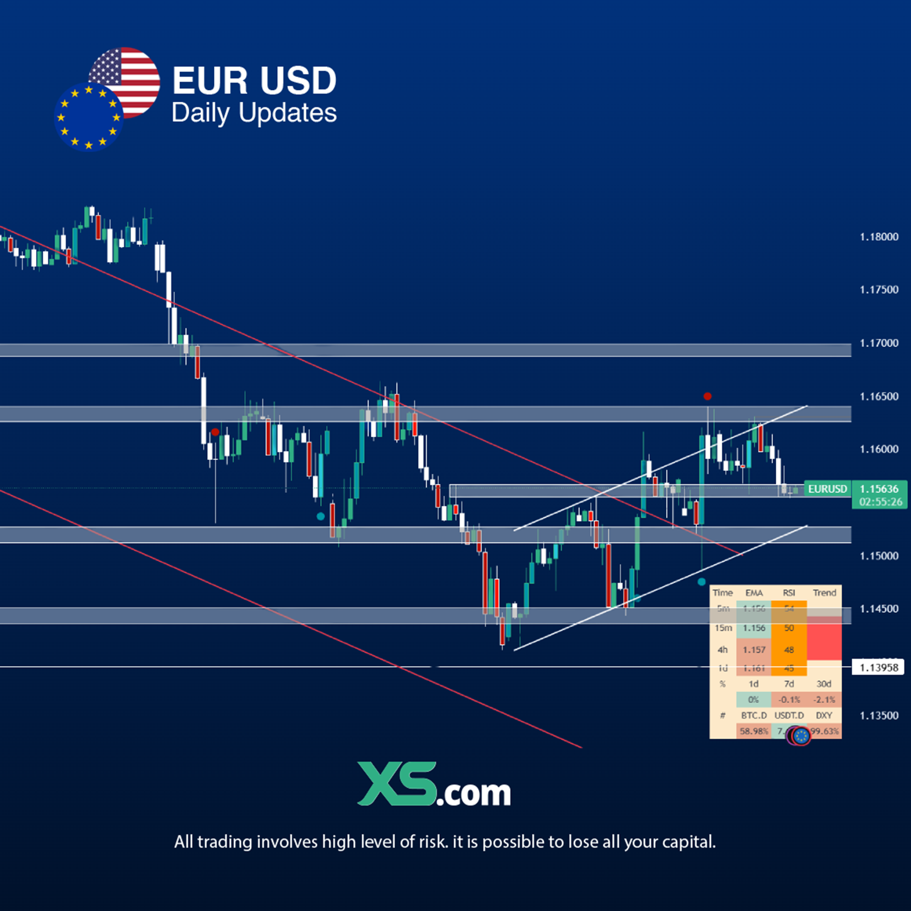 Vùng hỗ trợ 1.1510–1.1525 đóng vai trò quan trọng đối với cấu trúc ngắn hạn. Nếu giá giữ vững trên khu vực này và xuất hiện tín hiệu hồi phục, nhịp tăng có thể được nối lại với mục tiêu quay trở lại kiểm định vùng kháng cự 1.1625–1.1640. Ngược lại, nếu giá phá vỡ rõ ràng vùng hỗ trợ này, áp lực bán có thể gia tăng trở lại, qua đó mở ra khả năng EURUSD quay về kiểm định các vùng đáy thấp hơn quanh 1.1450.