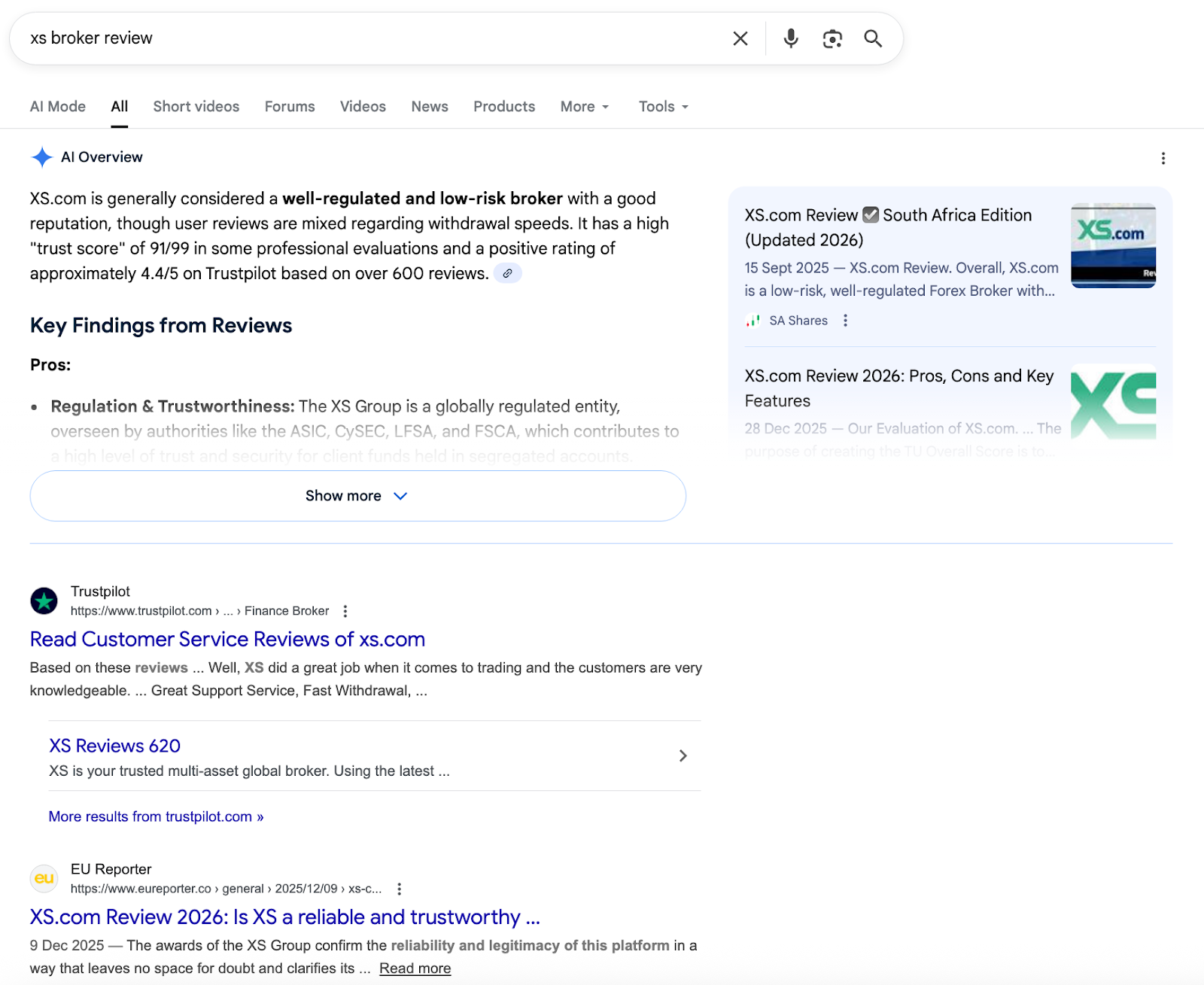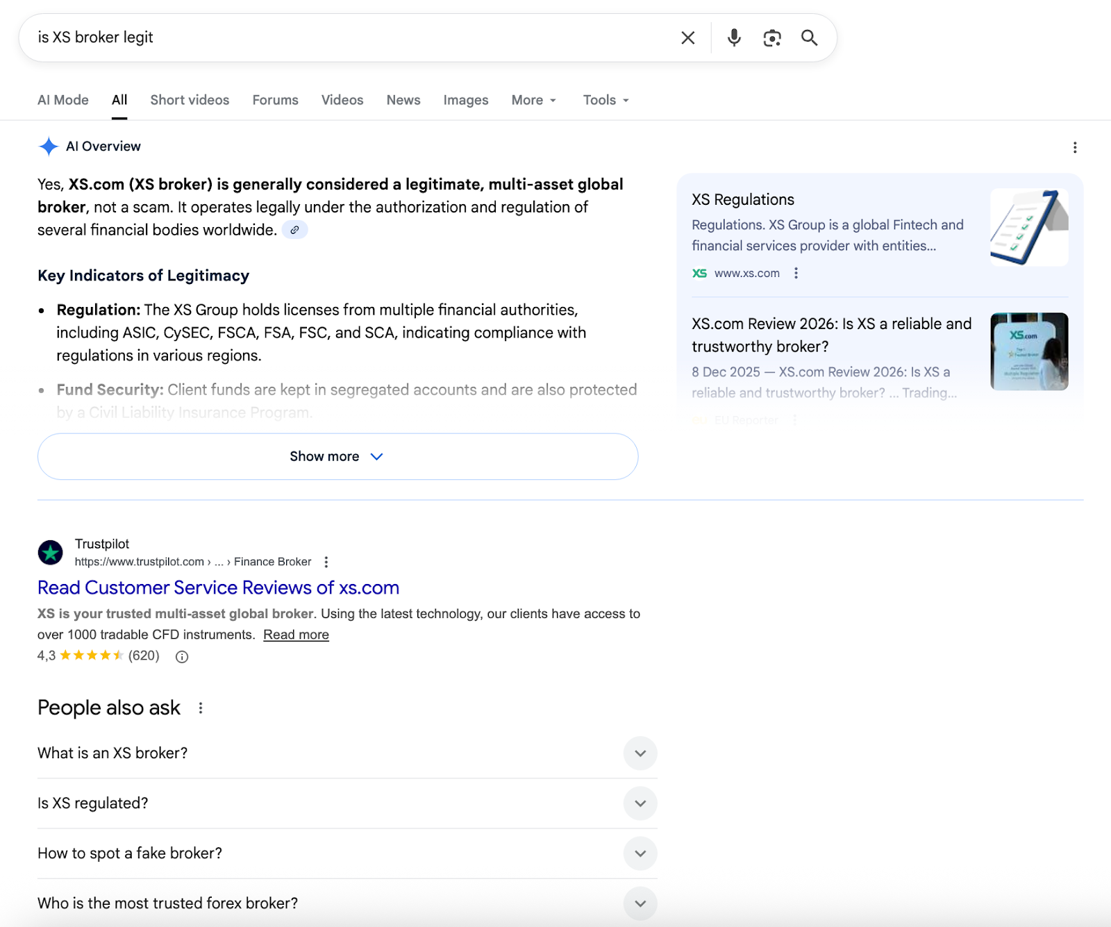 XS không hoạt động thông qua một pháp nhân duy nhất. Tùy thuộc vào nơi tài khoản được mở, các cơ quan quản lý khác nhau sẽ được áp dụng. Một số trader thuộc các khuôn khổ nghiêm ngặt hơn, chẳng hạn như những khuôn khổ được giám sát bởi Australian Securities and Investments Commission hoặc Cyprus Securities and Exchange Commission, vốn đi kèm với sự giám sát chặt chẽ hơn và các yêu cầu cao hơn.